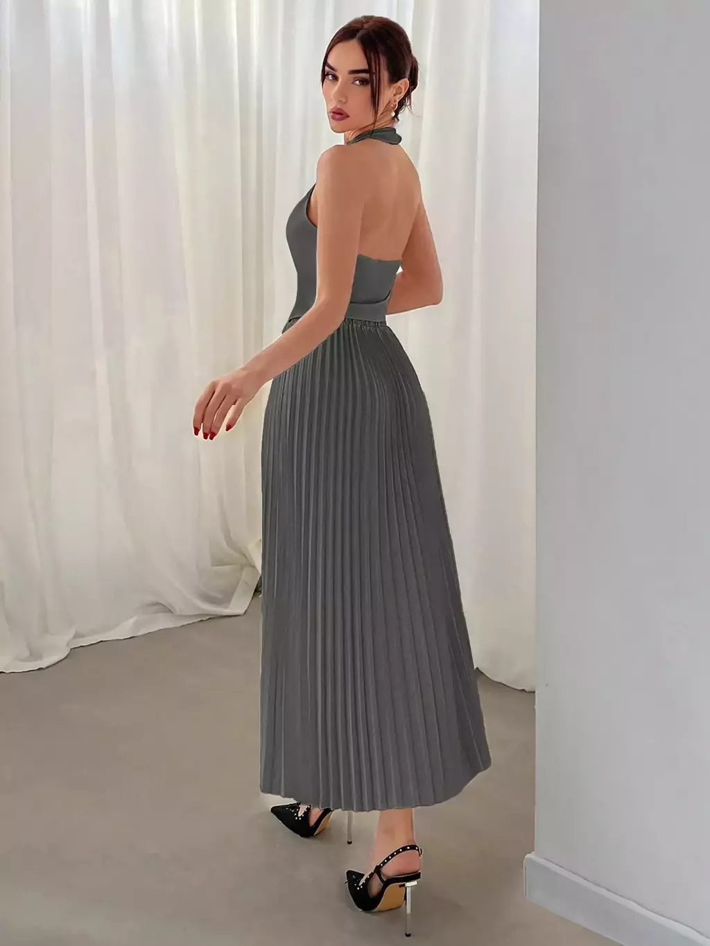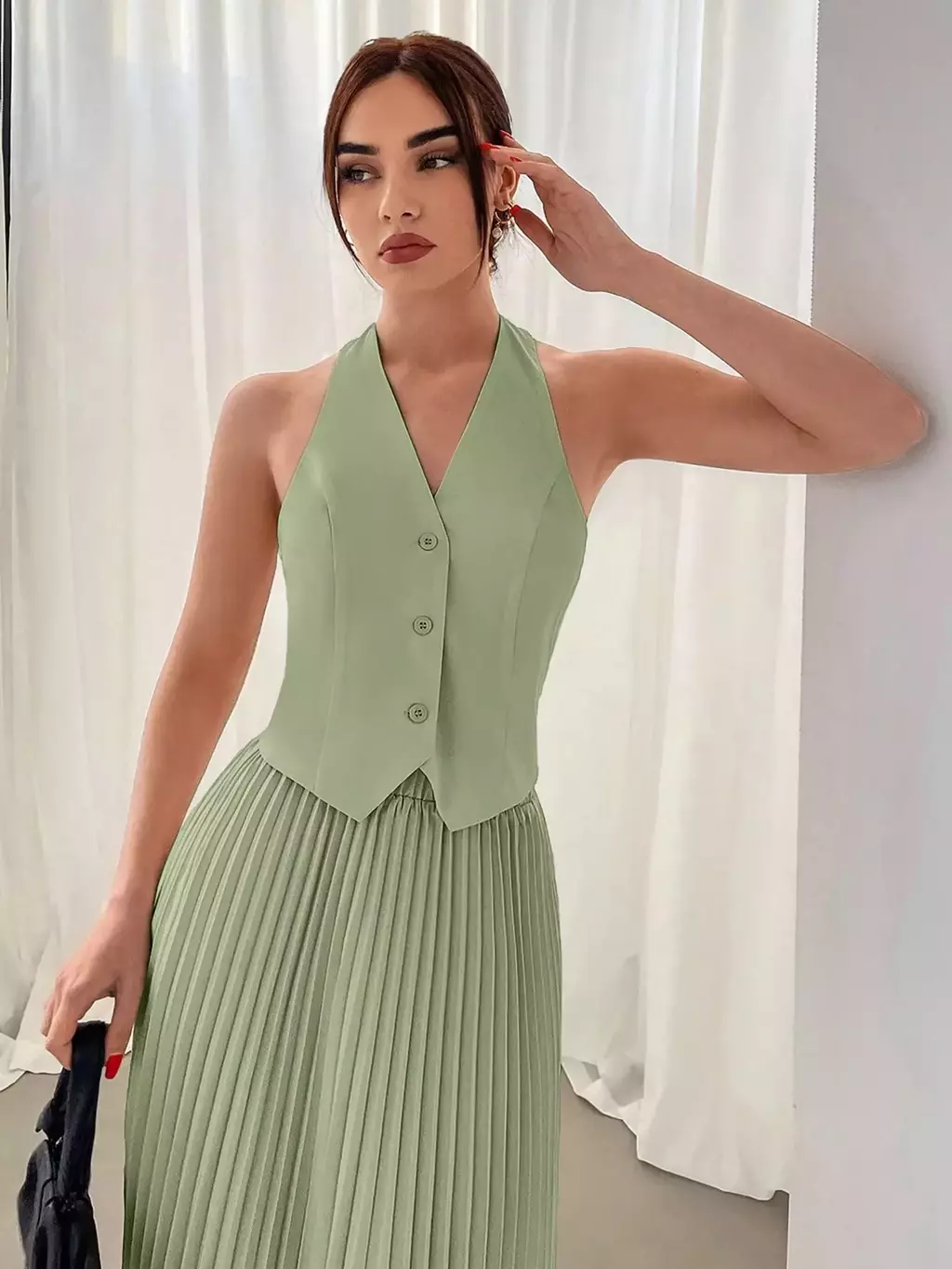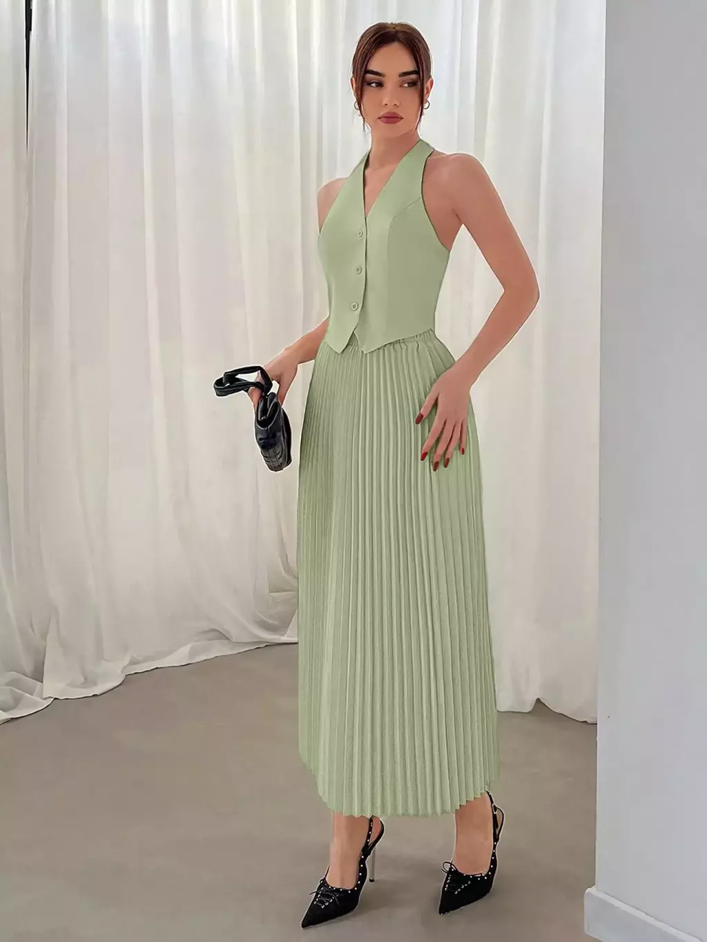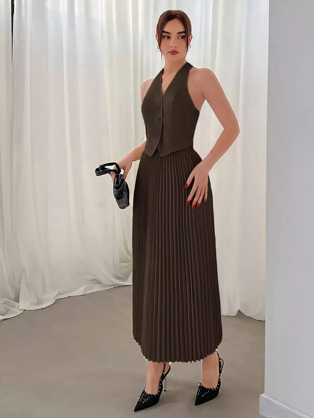 Descubra o charme do conjunto composto por colete de decote halter e saia plissada, pensado para mulheres que valorizam estilo e conforto nas estações mais frescas. Ideal para o Dia dos Namorados, este conjunto une design moderno e toque clássico, perfeito para ocasiões especiais ou um look refinado no dia a dia.