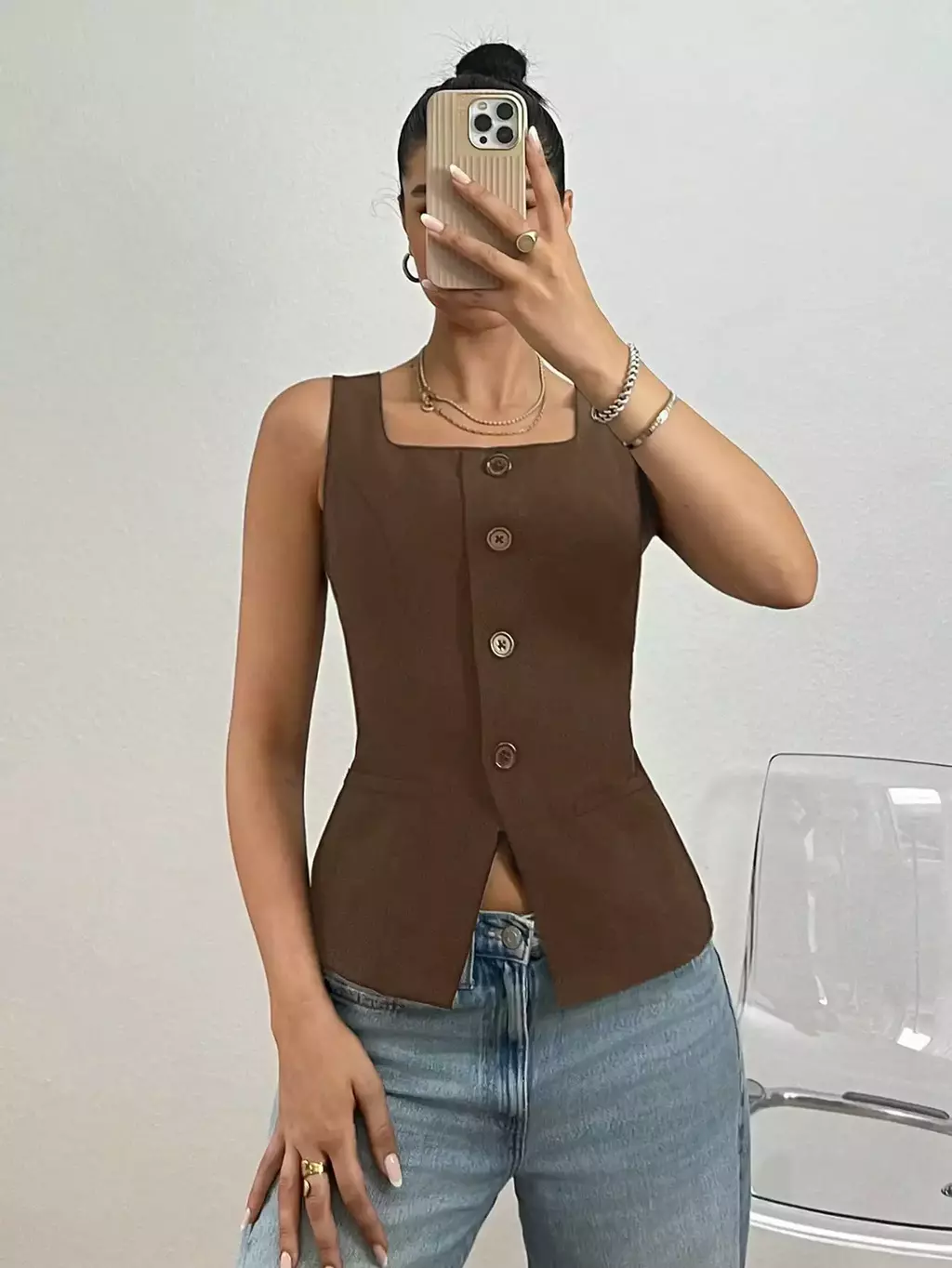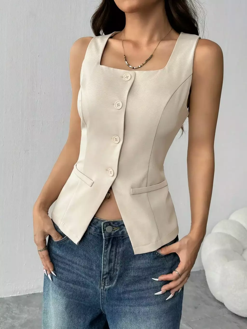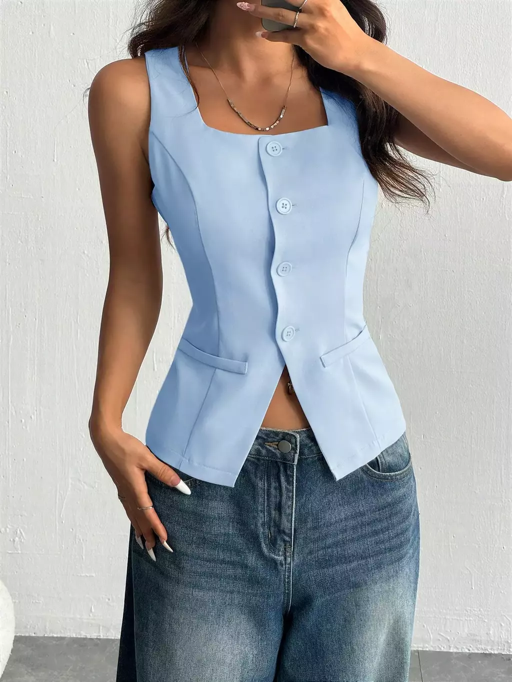 Blazer Justo: Sem mangas, com bolso e botões na frente, ele é puro charme em cor sólida para você arrasar no casual com estilo. Ajuste justo que abraça seu corpo como abraço de amigo (aquele que é bom, tá?). Ideal para dias de primavera e outono — leve, confortável e pronto para qualquer rolê. Vista-se para impressionar e para não passar calor, porque blazer sério é coisa do passado!