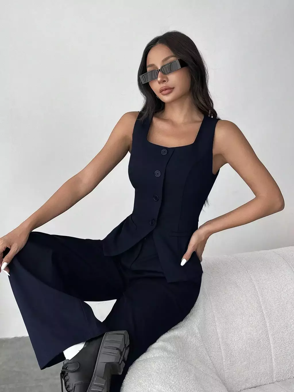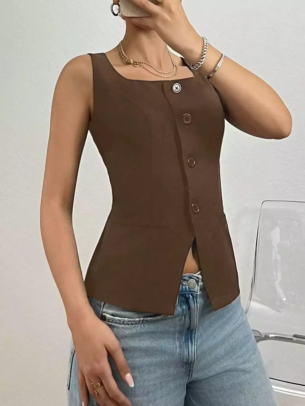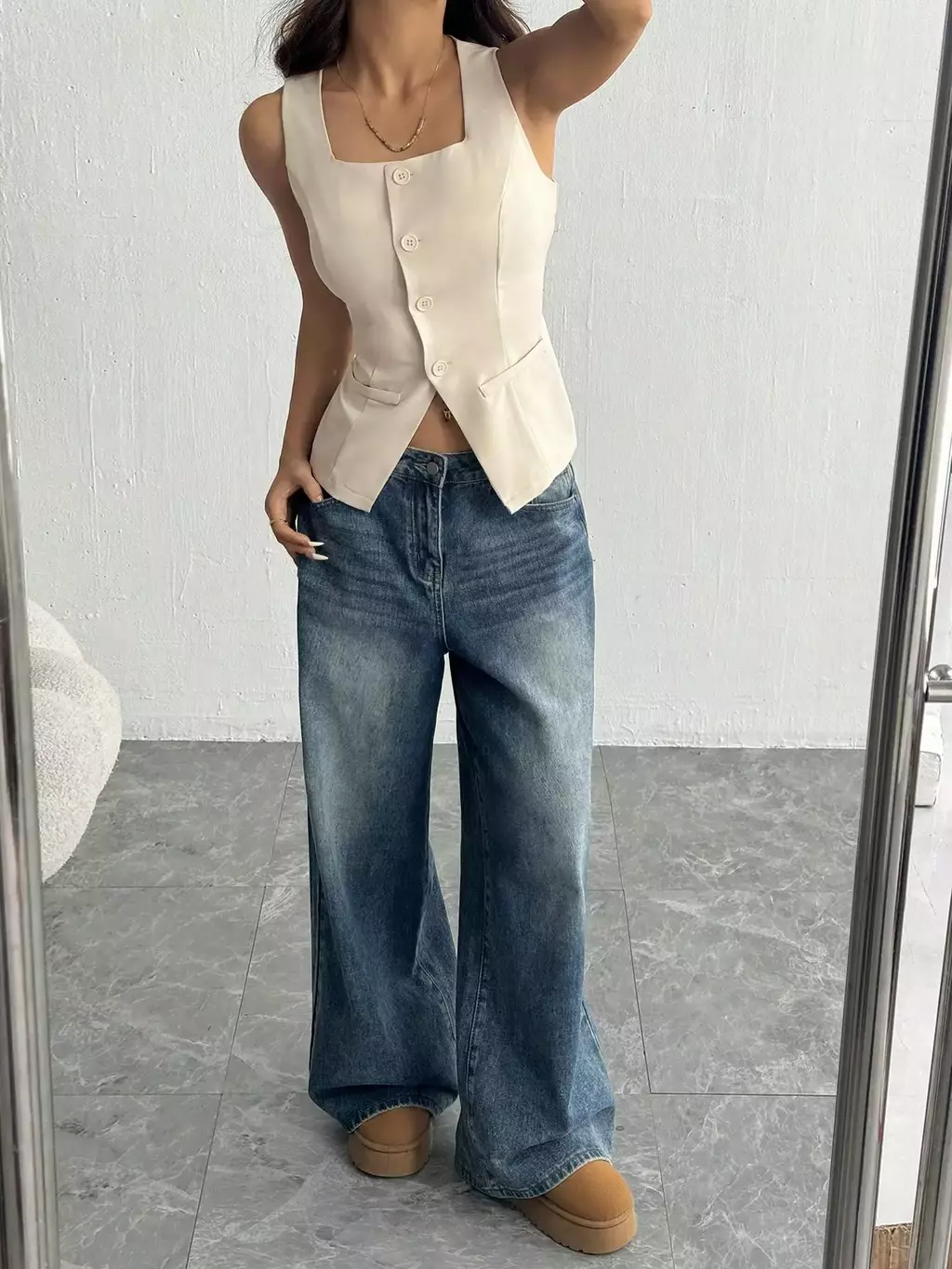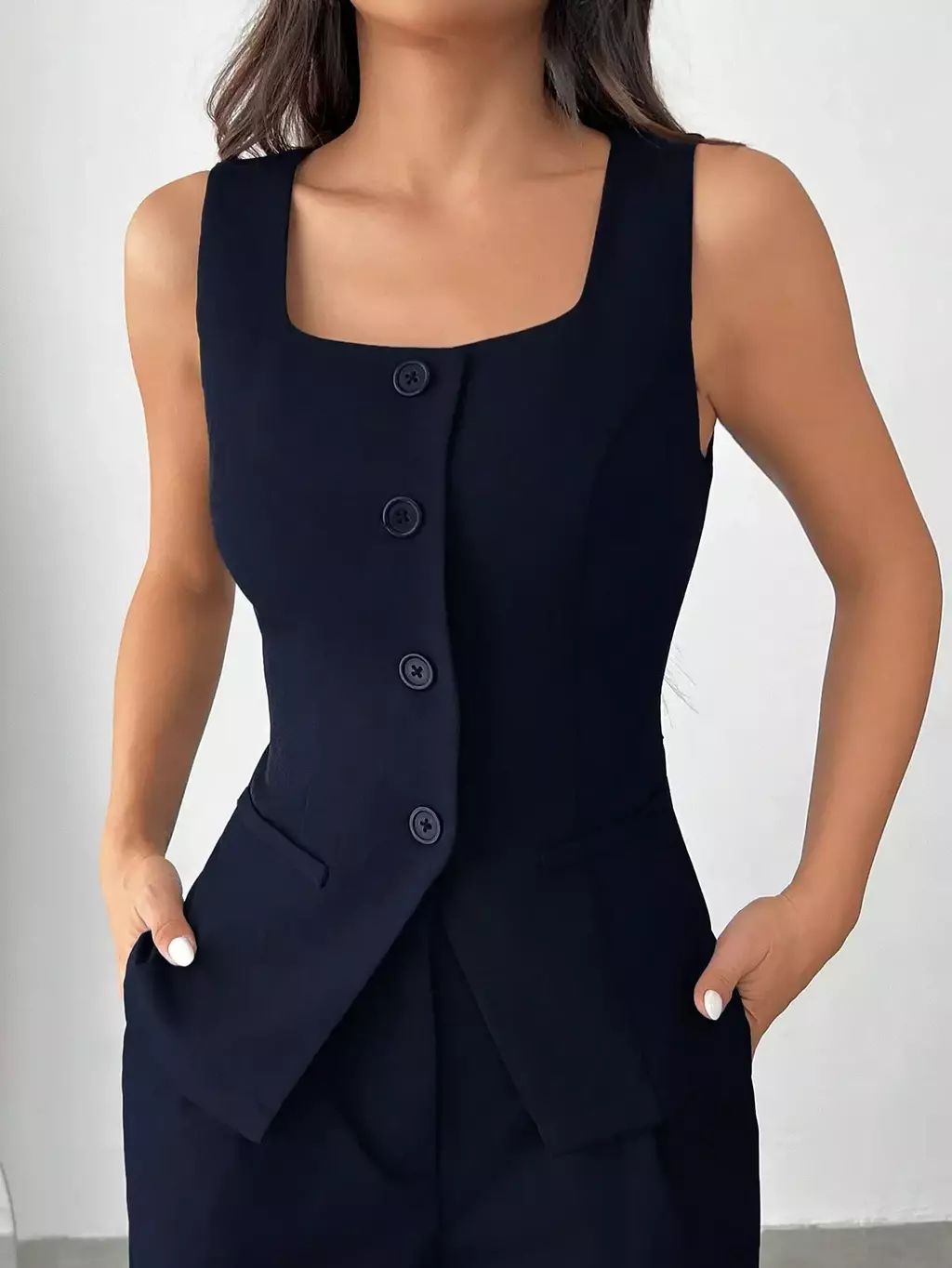 Blazer Justo: Sem mangas, com bolso e botões na frente, ele é puro charme em cor sólida para você arrasar no casual com estilo. Ajuste justo que abraça seu corpo como abraço de amigo (aquele que é bom, tá?). Ideal para dias de primavera e outono — leve, confortável e pronto para qualquer rolê. Vista-se para impressionar e para não passar calor, porque blazer sério é coisa do passado!
