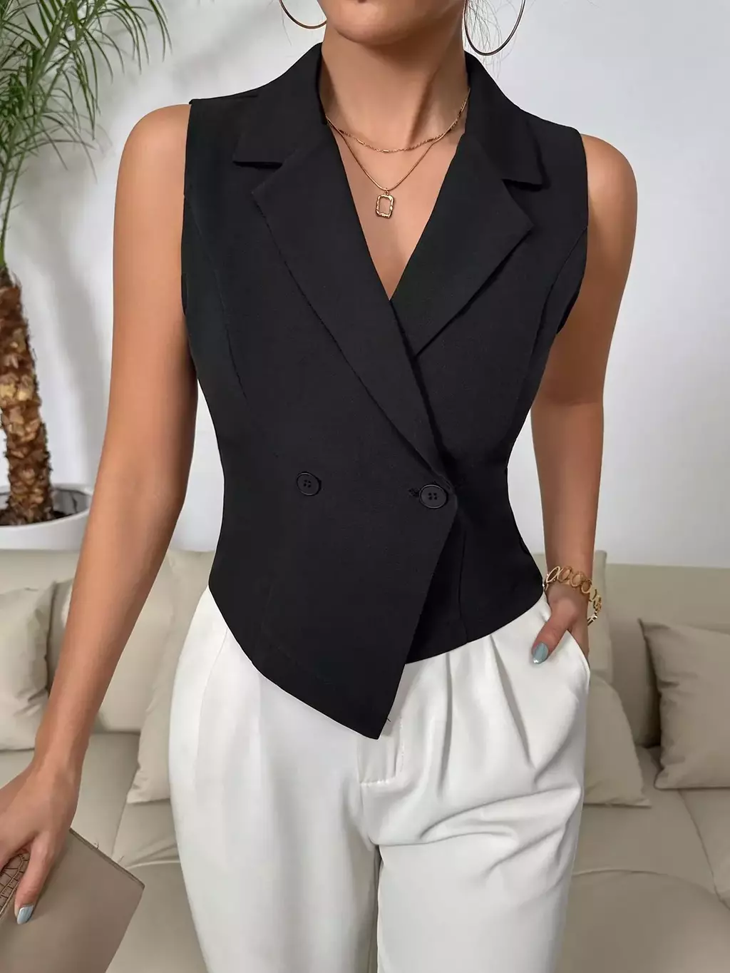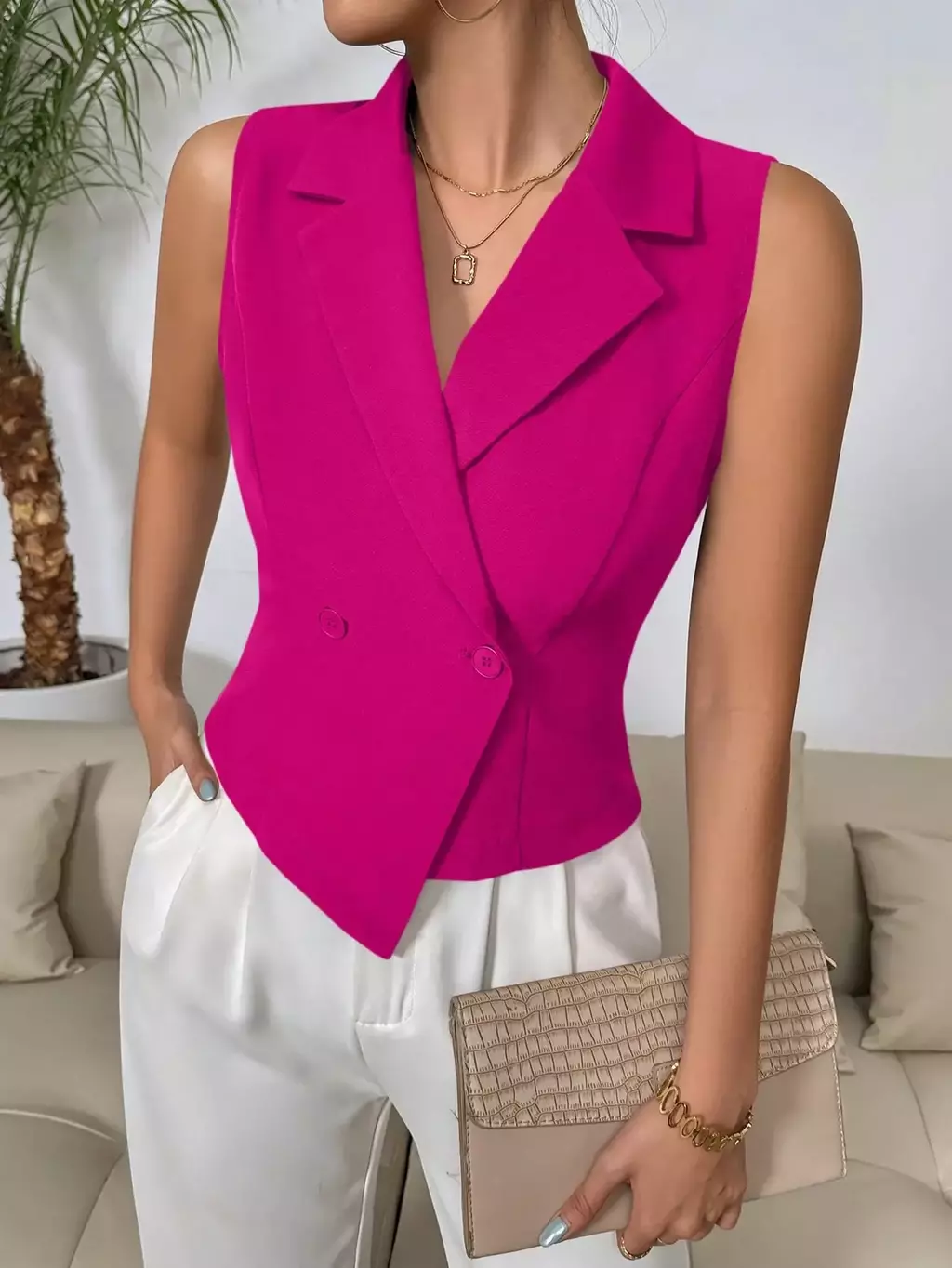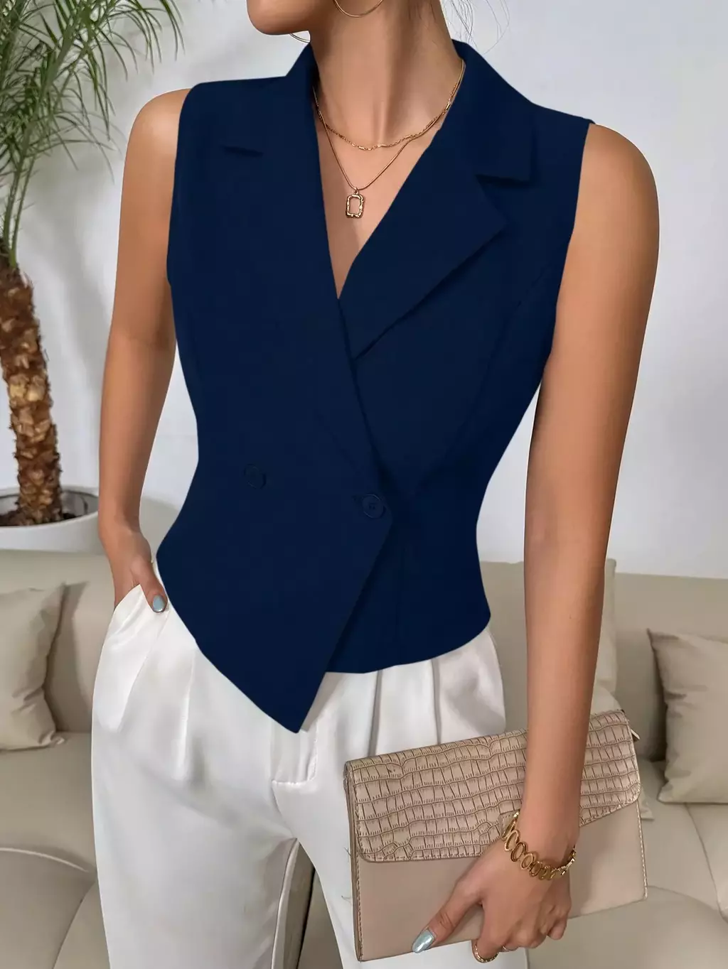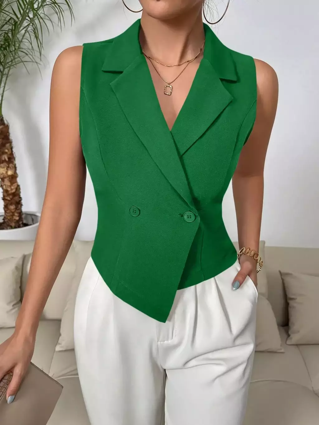 Colete de Terno Casual Duplo Sólido: o toque de elegância que sua primavera/verão pedia! Com colarinho de ponta estiloso e design sem mangas, ele é perfeito para quem quer arrasar no look sem passar calor. Feito com tecido leve e confortável, seu ajuste regular valoriza o corpo sem sufocar.