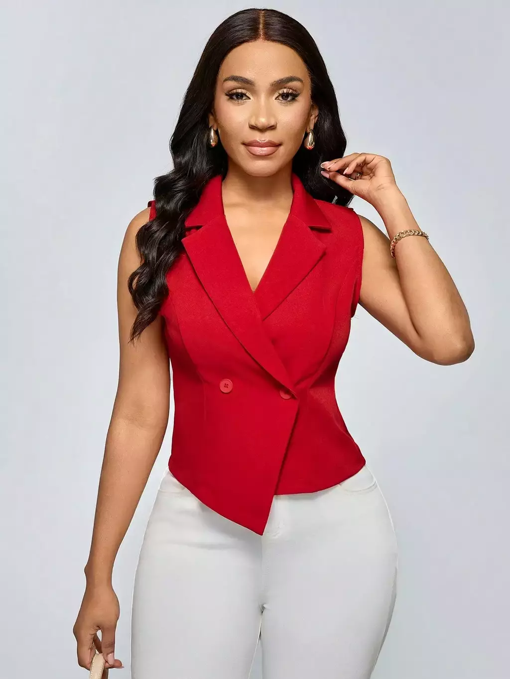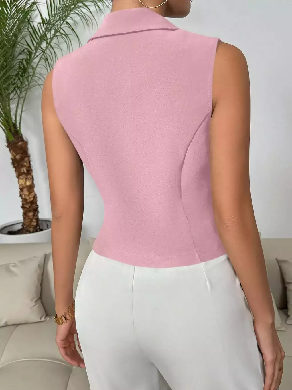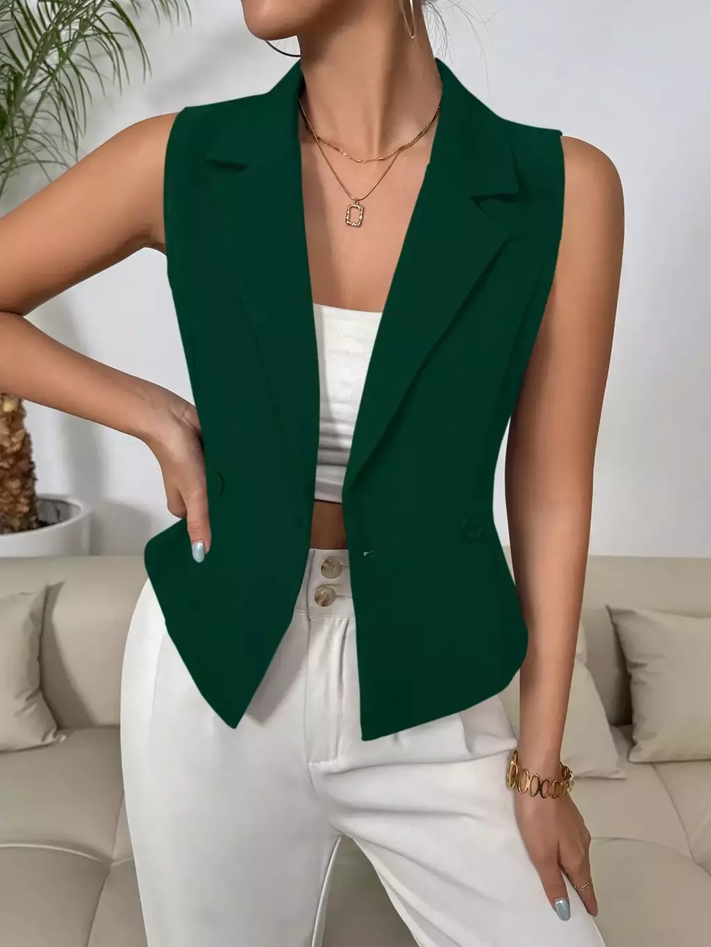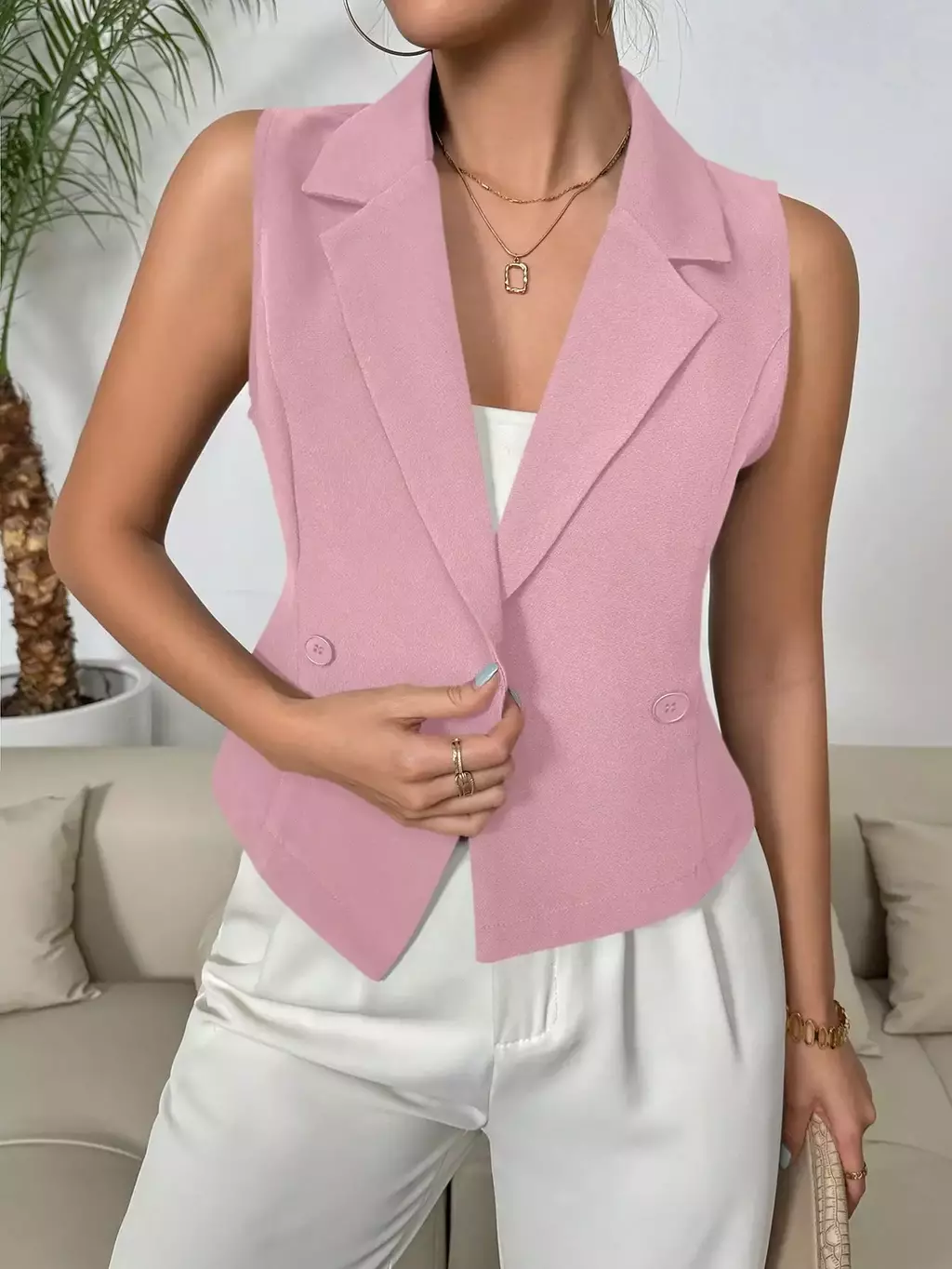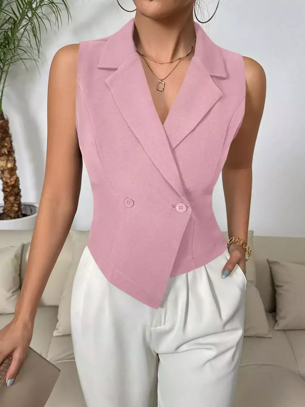 Colete de Terno Casual Duplo Sólido: o toque de elegância que sua primavera/verão pedia! Com colarinho de ponta estiloso e design sem mangas, ele é perfeito para quem quer arrasar no look sem passar calor. Feito com tecido leve e confortável, seu ajuste regular valoriza o corpo sem sufocar.