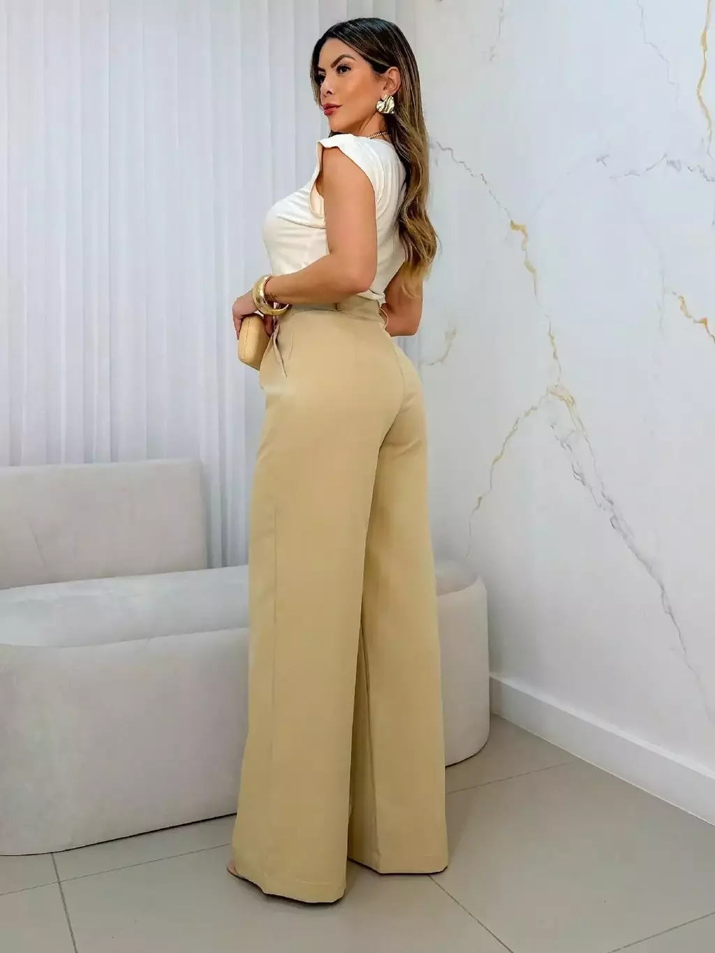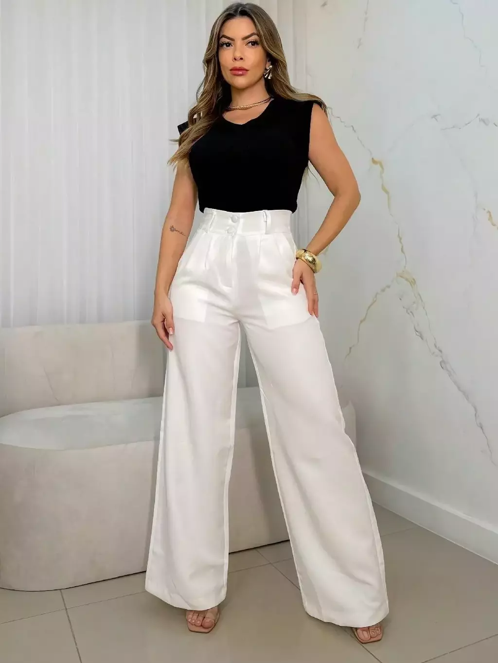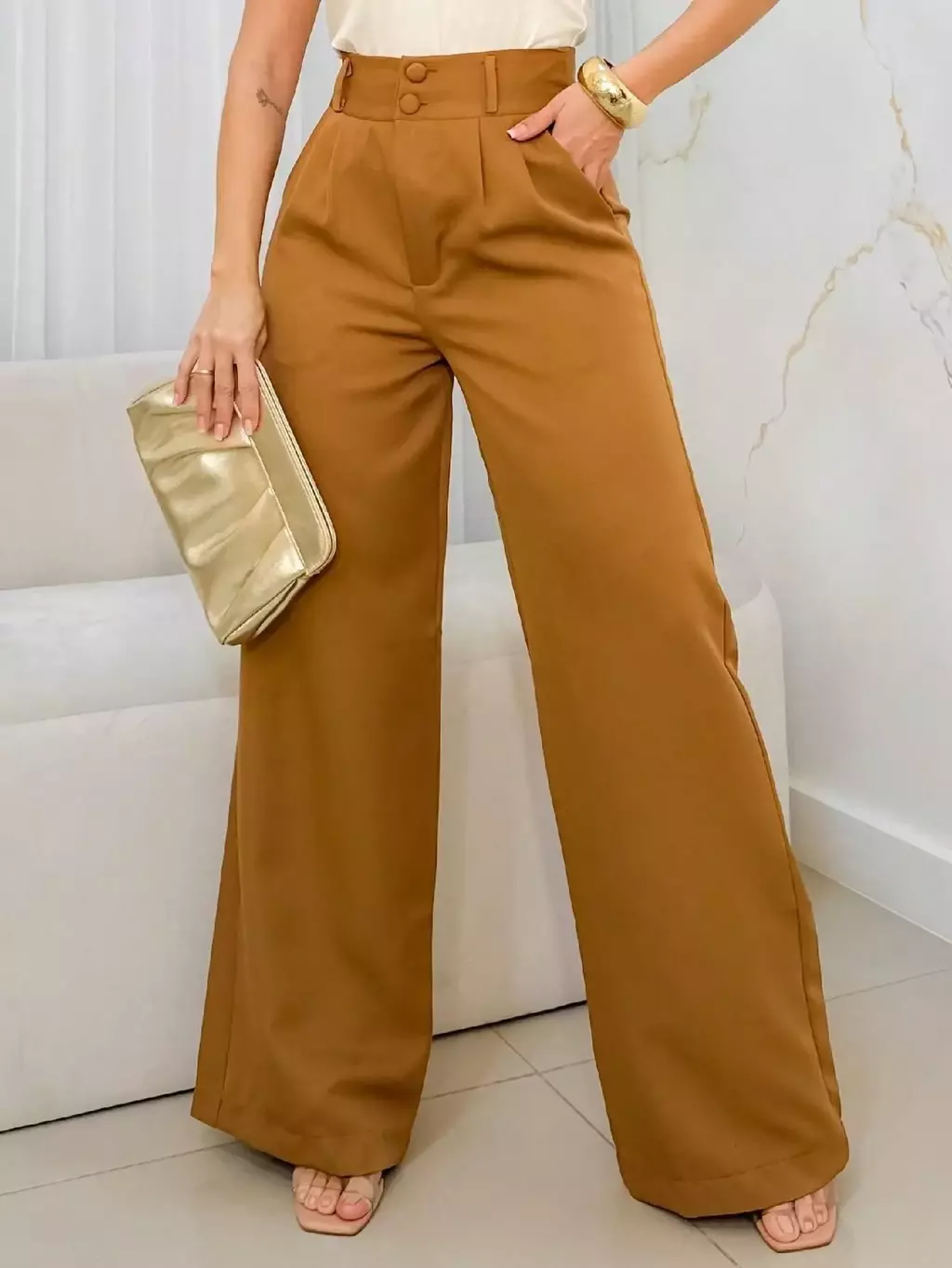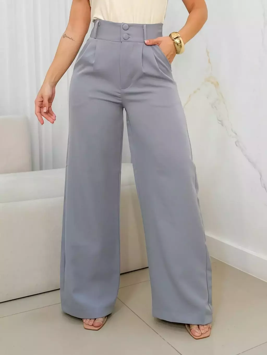 Principais características: - Cintura alta que valoriza a forma - Fechamento frontal com dois botões - Perna ampla e caimento fluido - Bolsos funcionais para maior praticidade - Material de toque macio e resistente