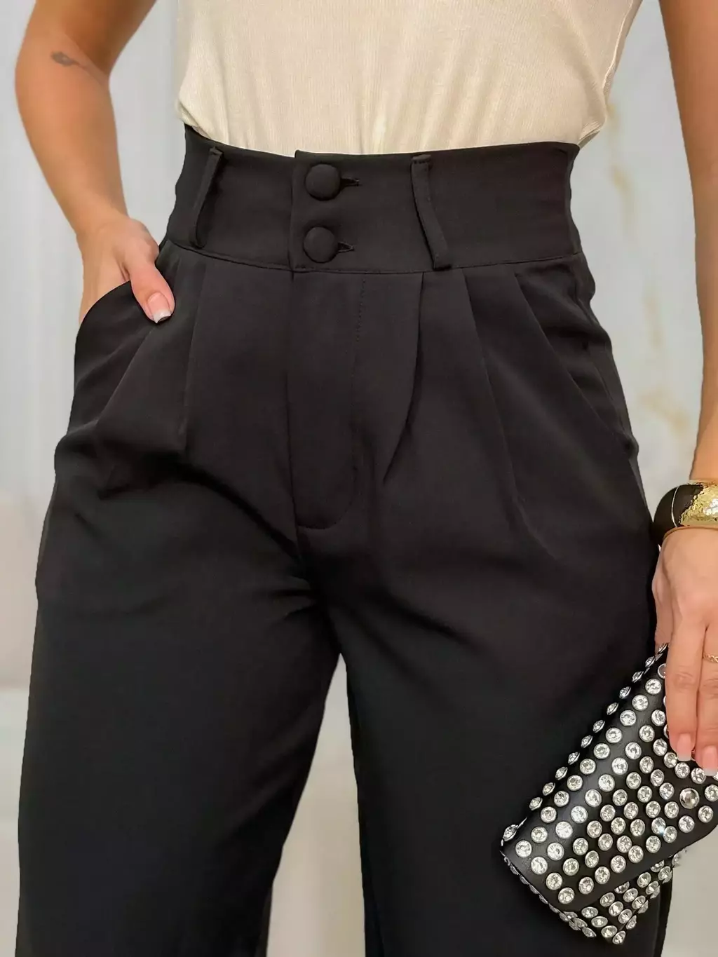 Confeccionada em tecido de alta qualidade, a calça apresenta fechamento frontal com dois botões, que adicionam um detalhe sutil e elegante ao design. Seu acabamento primoroso e bolsos discretos combinam praticidade e beleza, ideal para compor looks sofisticados para o escritório, eventos sociais ou ocasiões especiais.