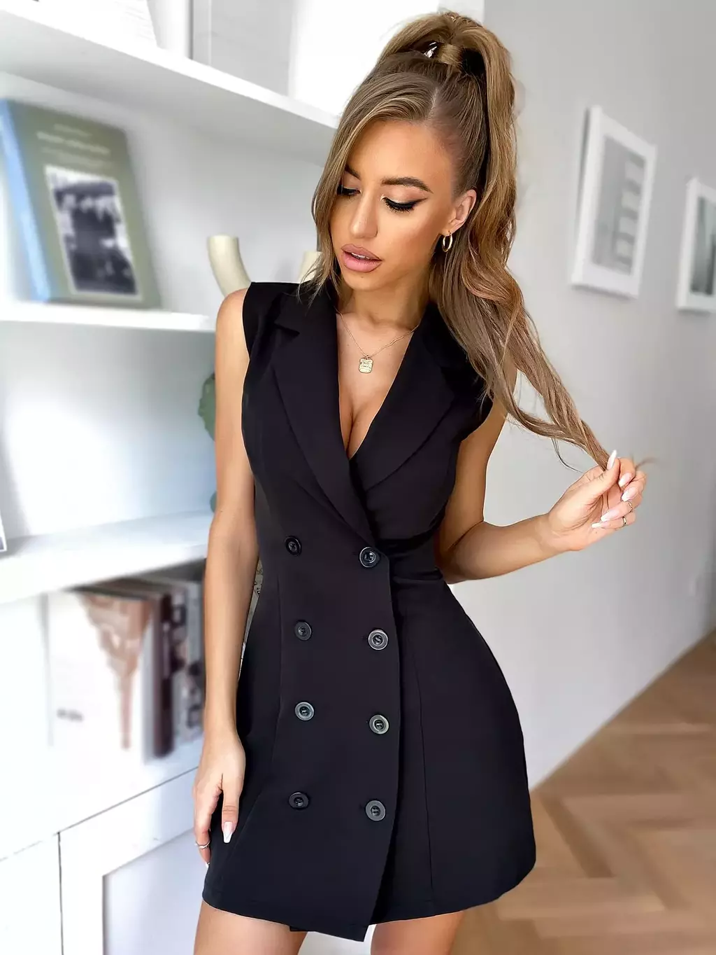 Vestido Botão Duplo Blazer Preto: o combo perfeito entre elegância e ousadia! Com seu corte curto e estilo blazer, ele te deixa pronta para arrasar no escritório ou naquela festa inesperada. Detalhe em botão duplo que é puro charme e modernidade. Ajuste slim fit para realçar suas curvas com conforto!